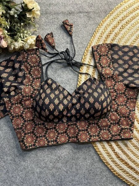 Navy black cotton Ajrakh printed readymade blouse by Malishka Export, soft, breathable, and perfect for a traditional yet stylish look.